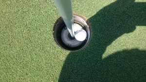グリーン上に無い時点でもしかしてと思っていたが、ここである程度確信に変わり、キャディさんに念のためカップ見てもらうようにお願い。