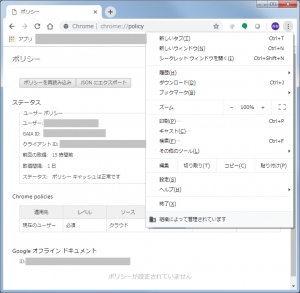 chrome://policy でポリシーの画面を表示させて、何らかの設定を行っているときはそのポリシーを消せば上記の表示は消えます。自分の場合は会社のイントラのSSL証明書問題があったときにポリシーを変更していたので、それを消したら無事に消えました。