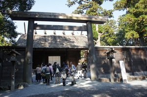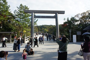 バスで移動して、内宮を参拝。参拝自体は時間掛からないのね。神宮自体の人出はさほどでは無かったが、参道は遠足が多かったのかかなりの人混み。