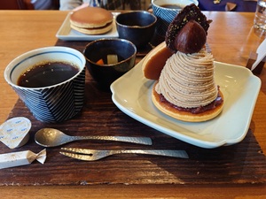 夢想園で温泉つかった後、鞠智でモンブランどら焼き。寒いので店内でいただく。
