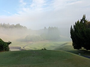 風が無いのは良いんだけど、朝もやのティーオフ。