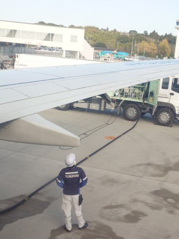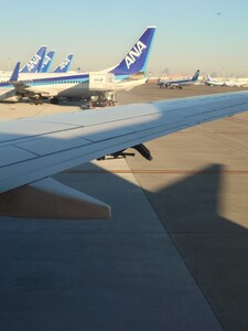 朝6時に羽田空港。ANA791で大分に向かう。フラップのカバーが付いてないやん。ロッドがむき出しで心細い。
